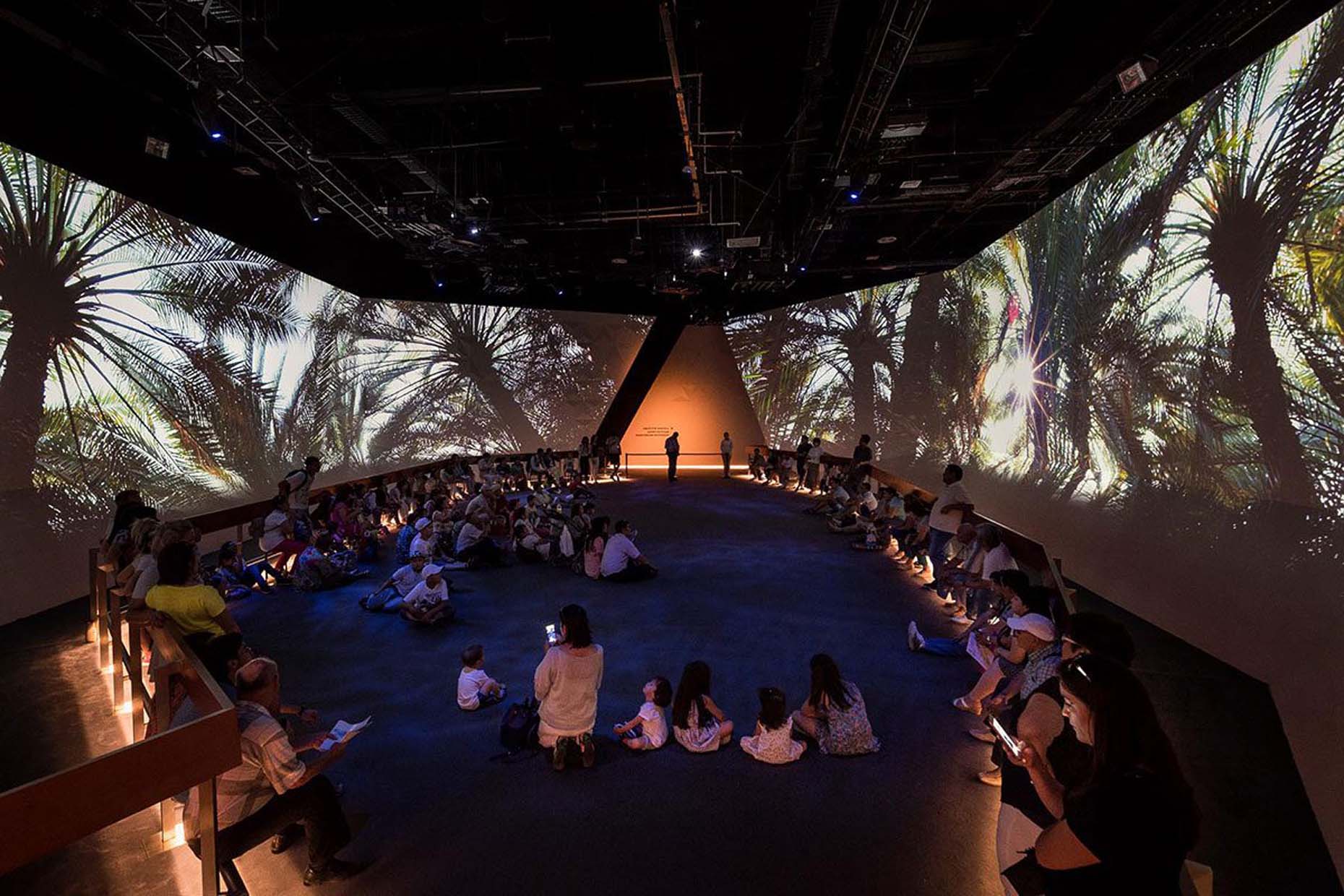 Más de 1.000 m2 de exposición culminan en la gran joya de la corona, un espacio audiovisual inmersivo de 270 grados, un videomapping que te zambulle de lleno en unos emiratos que apuestan por la sostenibilidad y el futuro.