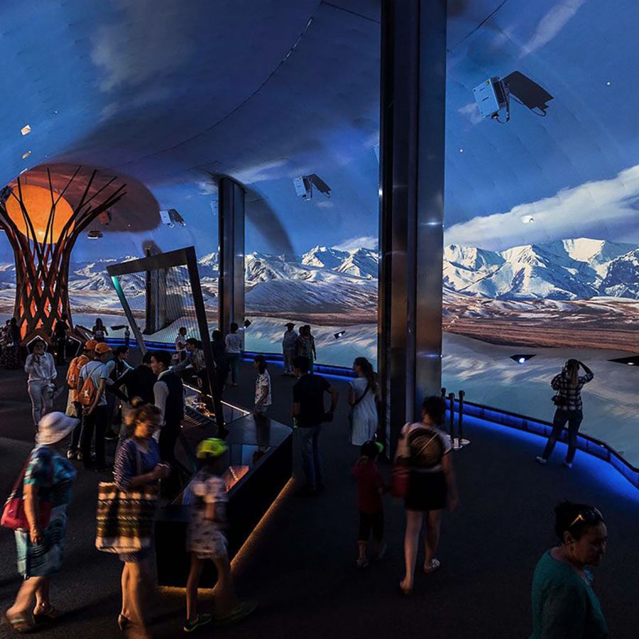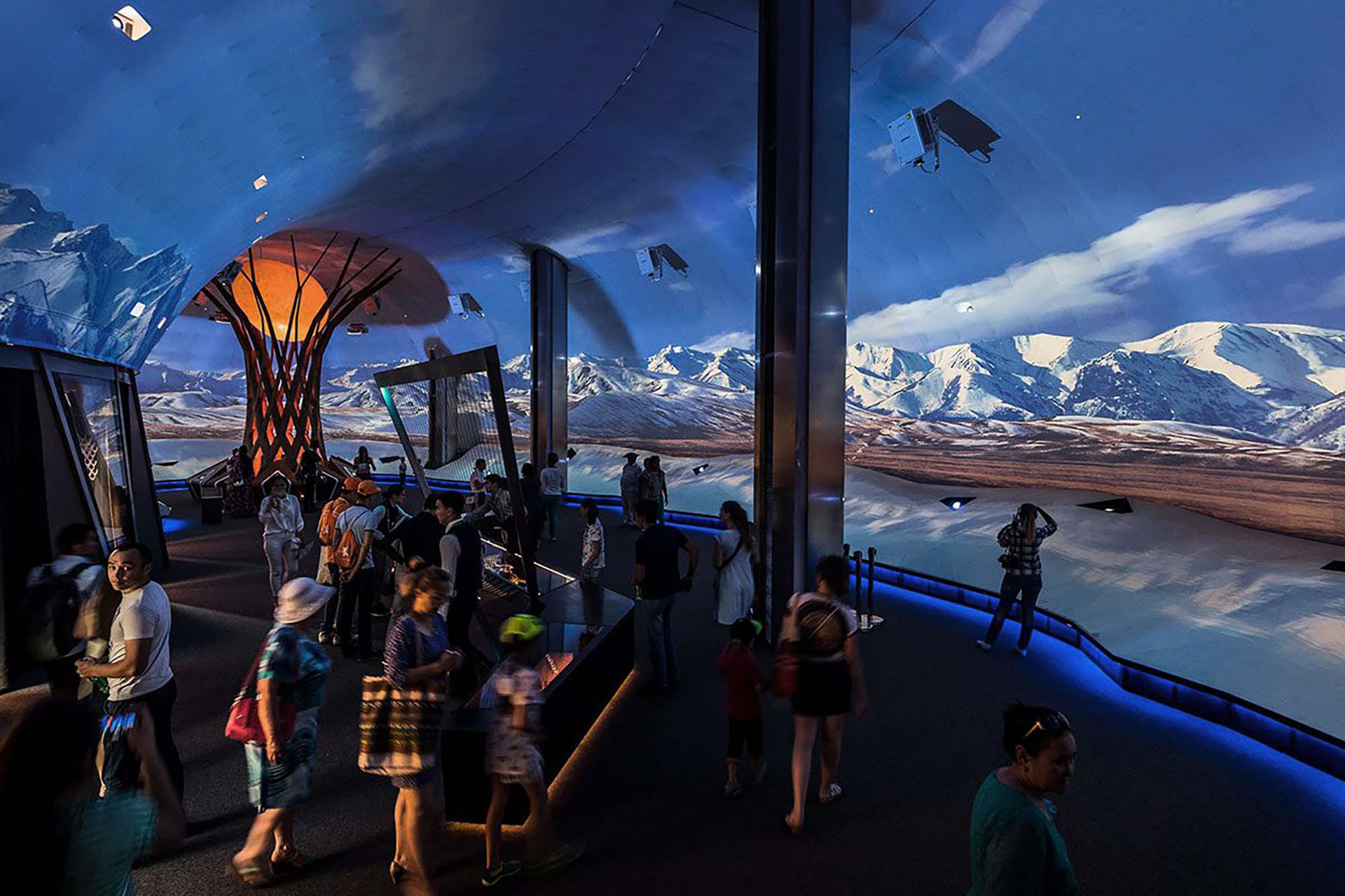 Una esfera dividida en ocho plantas constituye el Pabellón Nacional de Kazajstán en el Expo de Astana de 2017. Su interior alberga uno de los audiovisuales inmersivos más impactantes del momento, gracias a un videomapping de gran formato que se extiende sobre una estructura orgánica de más de 1.110 m2.